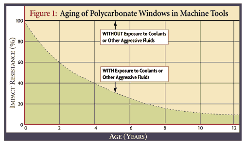It was a 12-year study exposing polycarbonates to coolants. The findings were alarming. After just two years, polycarbonates lose 40 percent of their impact characteristics and 90 percent after only seven years. This means that a piece of polycarbonate that started out being .375 inch [9.52 mm] thick now has the impact resistance of a piece that is .0563 inch [1.43 mm] thick. That is simply unacceptable. This study did not take into account any chip-load or higher-pressure coolant applications. Either of these factors would accelerate the degradation rate several times over.